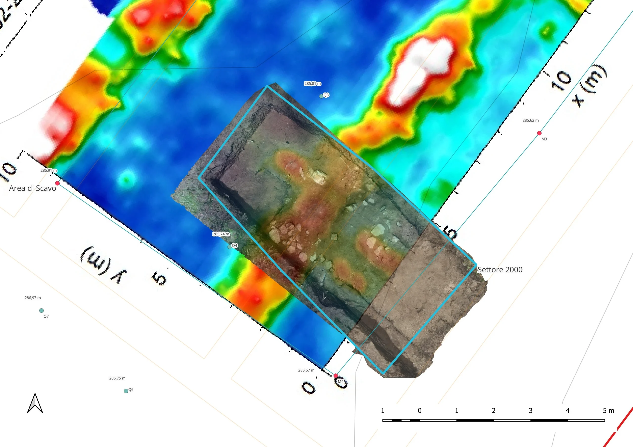 La galleria qui di seguito mostra invece delle elaborazioni dei modelli sopradescritti, i quali sono stati inseriti in un GIS (Geographic Information System) alle loro coordinate terrestri originali. In questo modo è stato possibile sovrapporle ai rilievi GPR del sottosuolo, trovando un match tra le evidenze scansionate e quelle effettivamente messe in luce.