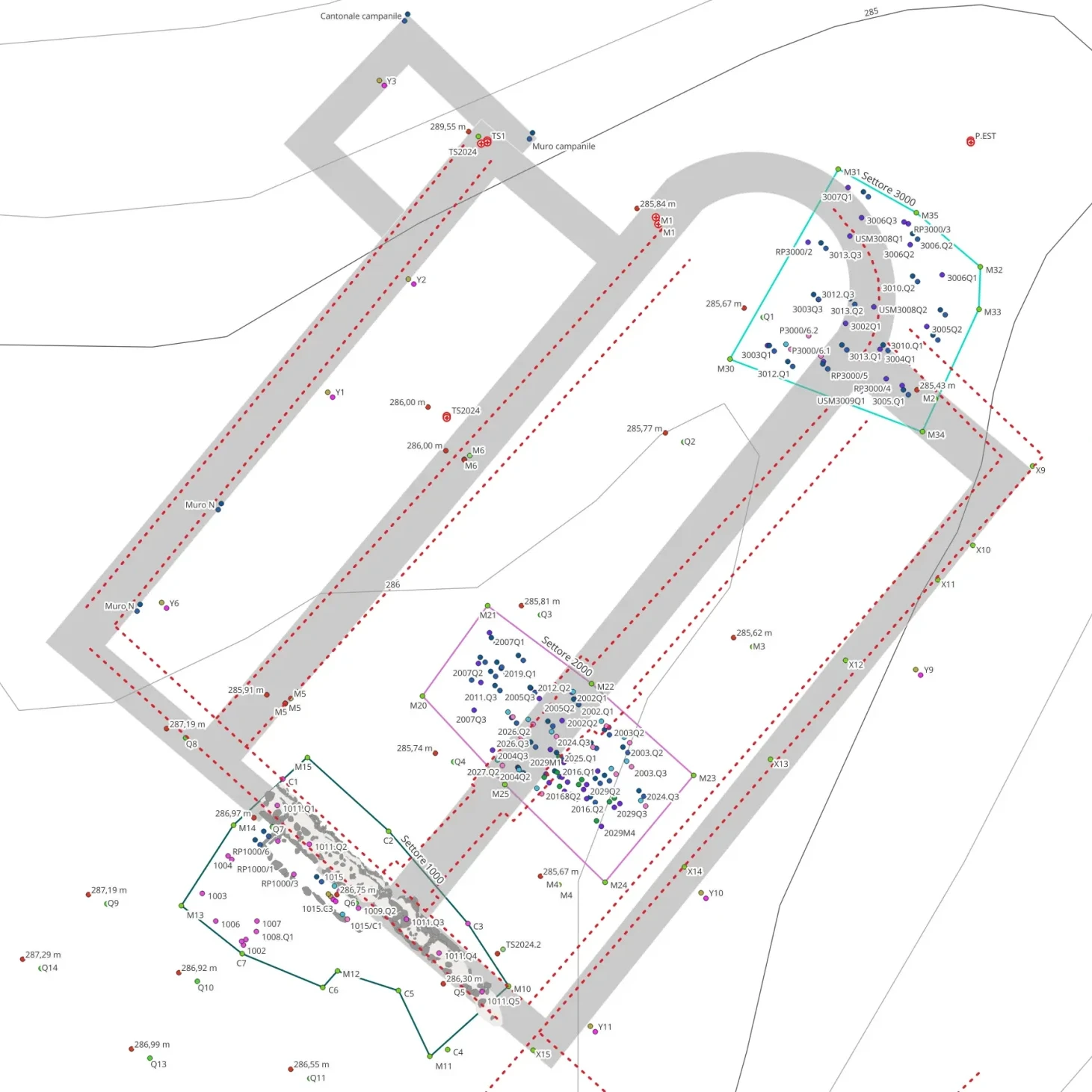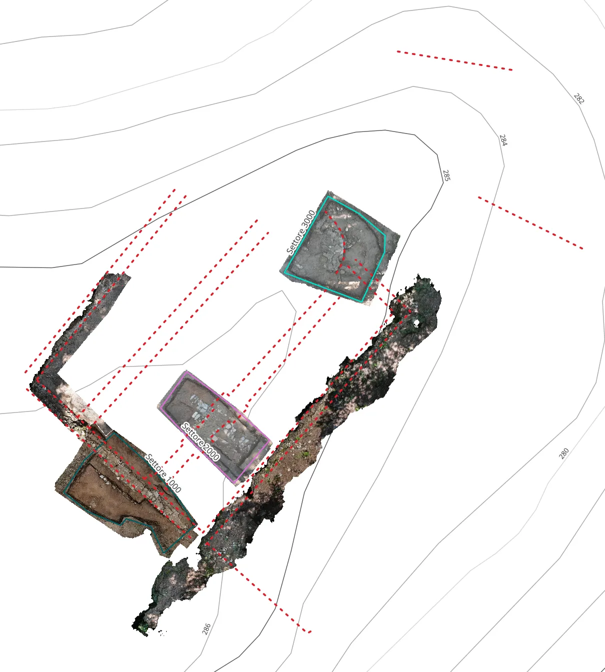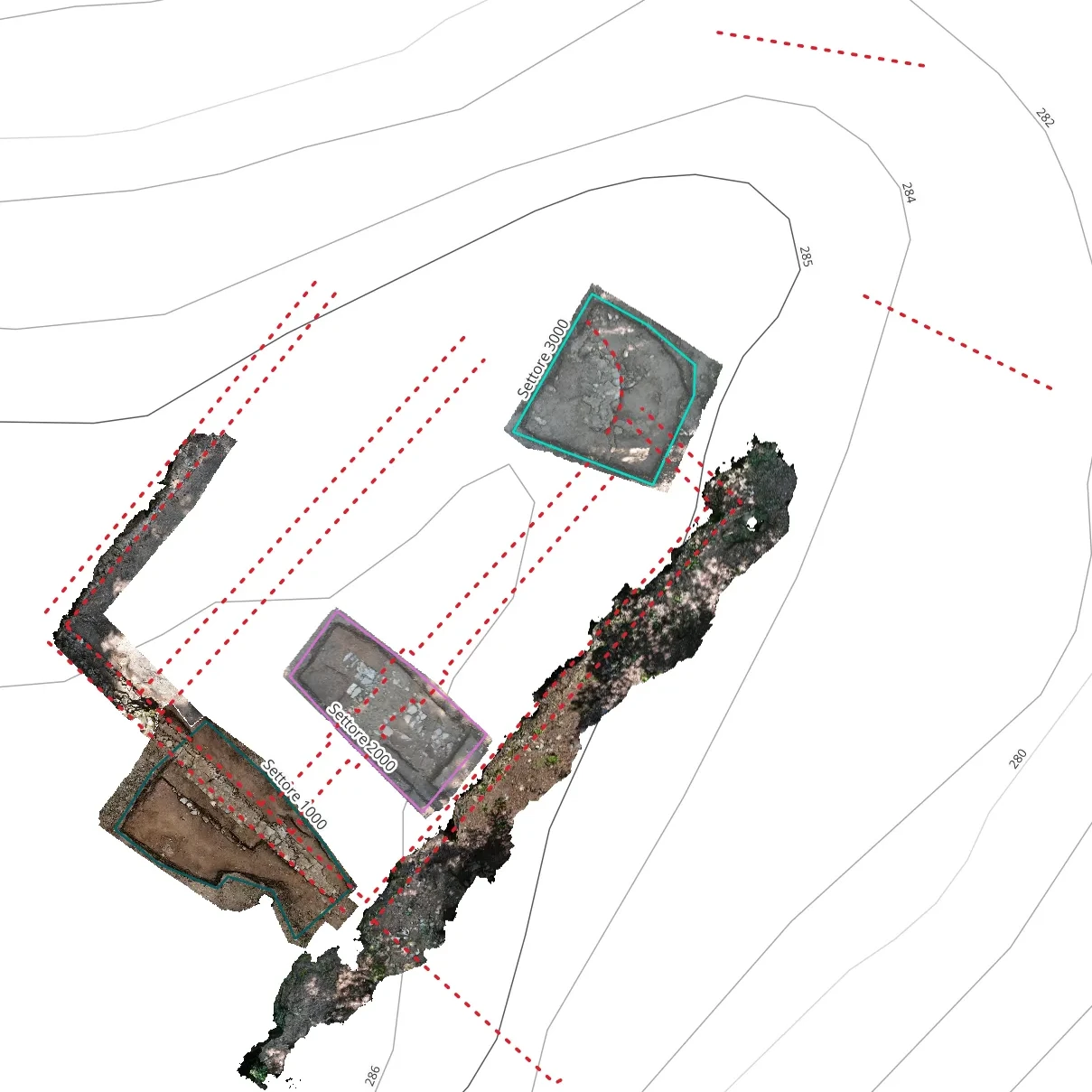 Lo strumento principale utilizzato per il rilievo delle emergenze è la stazione totale, un dispositivo ottico che consente di acquisire le coordinate dei punti presi nella realtà, i quali vengono inseriti all’interno di un ambiente informatico di elaborazione topografica, denominato GIS (Geographic Information System), che consente di georiferirli nello spazio geografico e creare mappe complesse e multilivello. Qui sotto si riporta uno screenshot del GIS di scavo in fase di elaborazione, con evidenziate le aree di scavo, la planimetria della chiesa ipotizzata in partenza (in grigio) e le reali proiezioni basate sulle prese strumentali (tratteggiate in rosso).