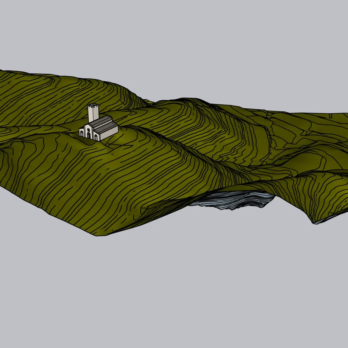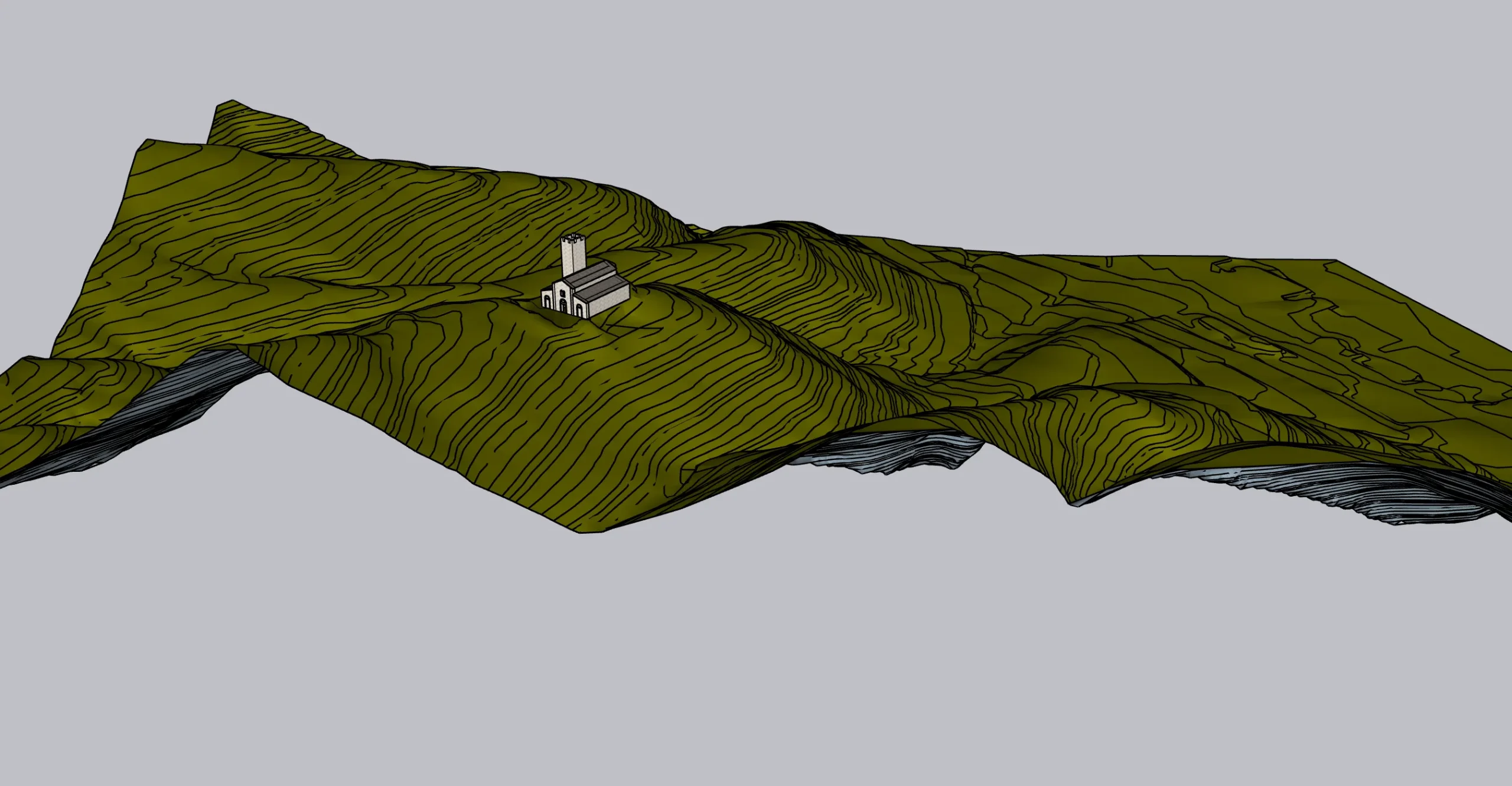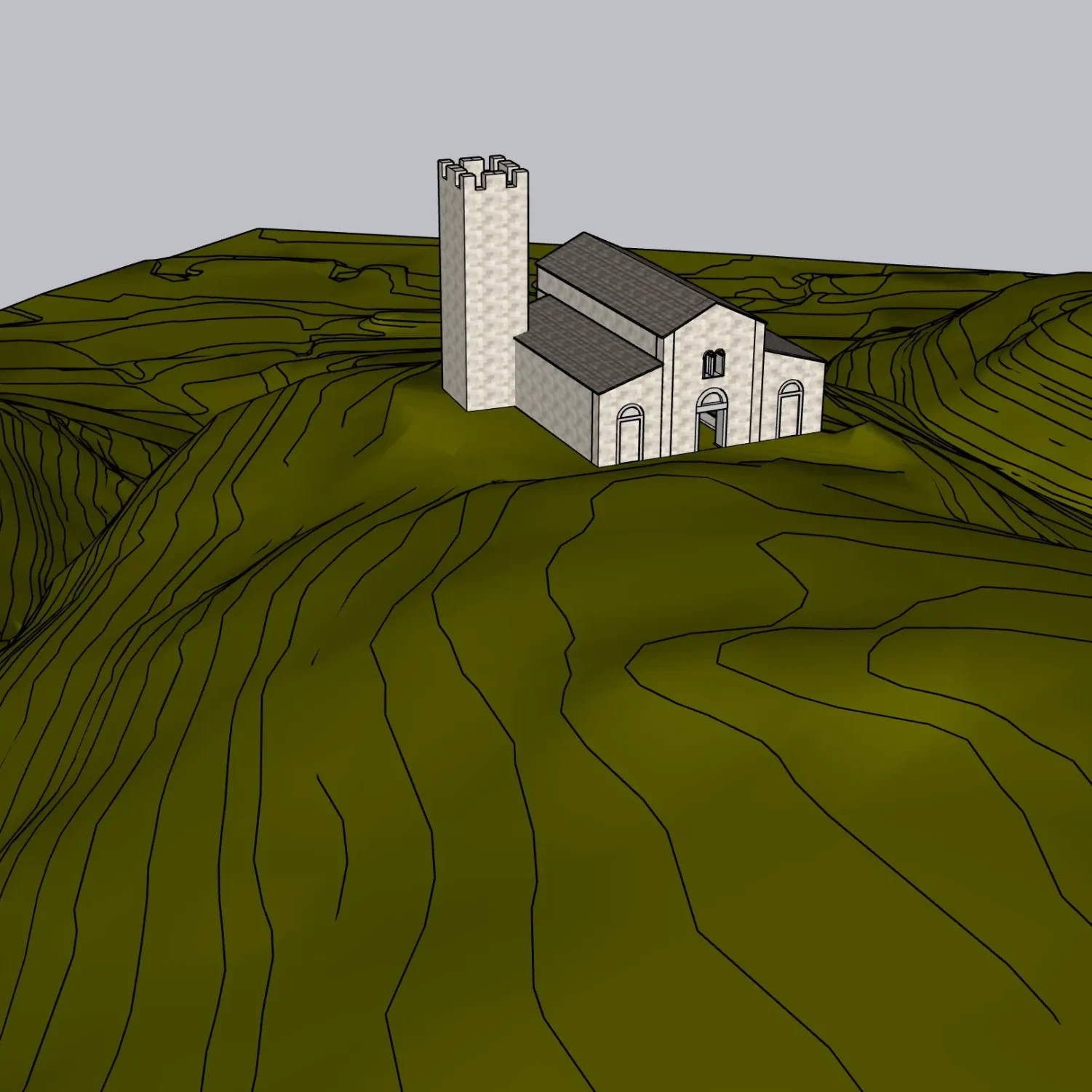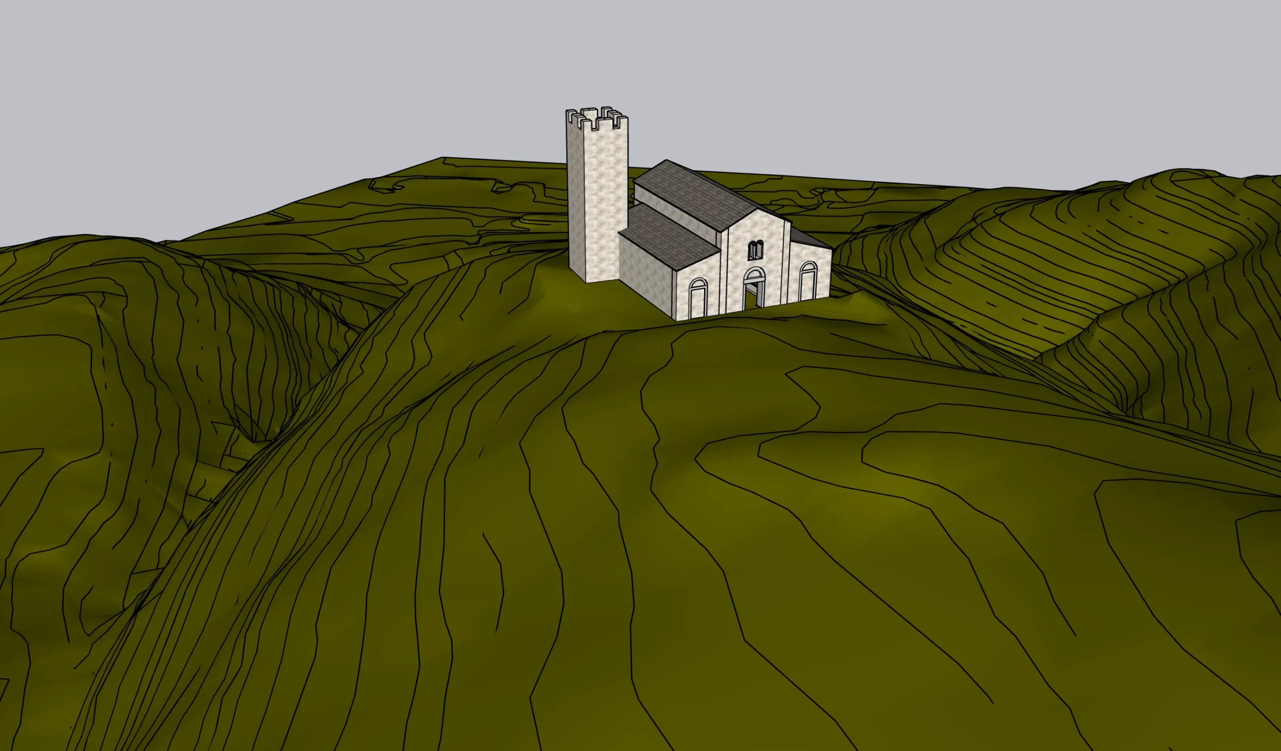 Qui di seguito un ensemble dei modelli 3D delle tre aree e degli elementi del terreno circostanti (i perimetrali della chiesa e il campanile).